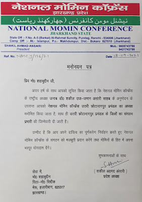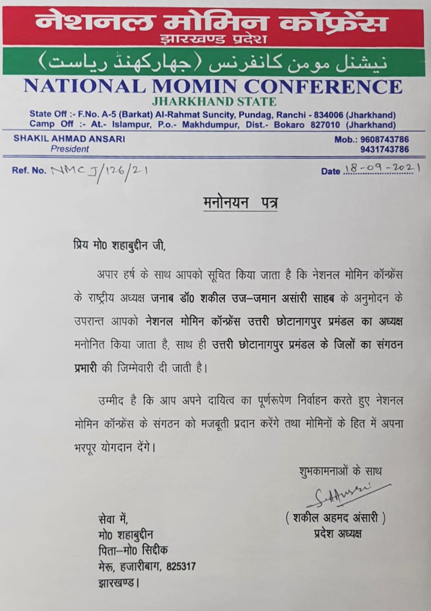 समाजसेवी मोहम्मद शहाबुद्दीन को नेशनल मोमिन कॉन्फ्रेंस का उत्तरी छोटानागपुर प्रमंडल अध्यक्ष वा संगठन प्रभारी का मिला पदभार।