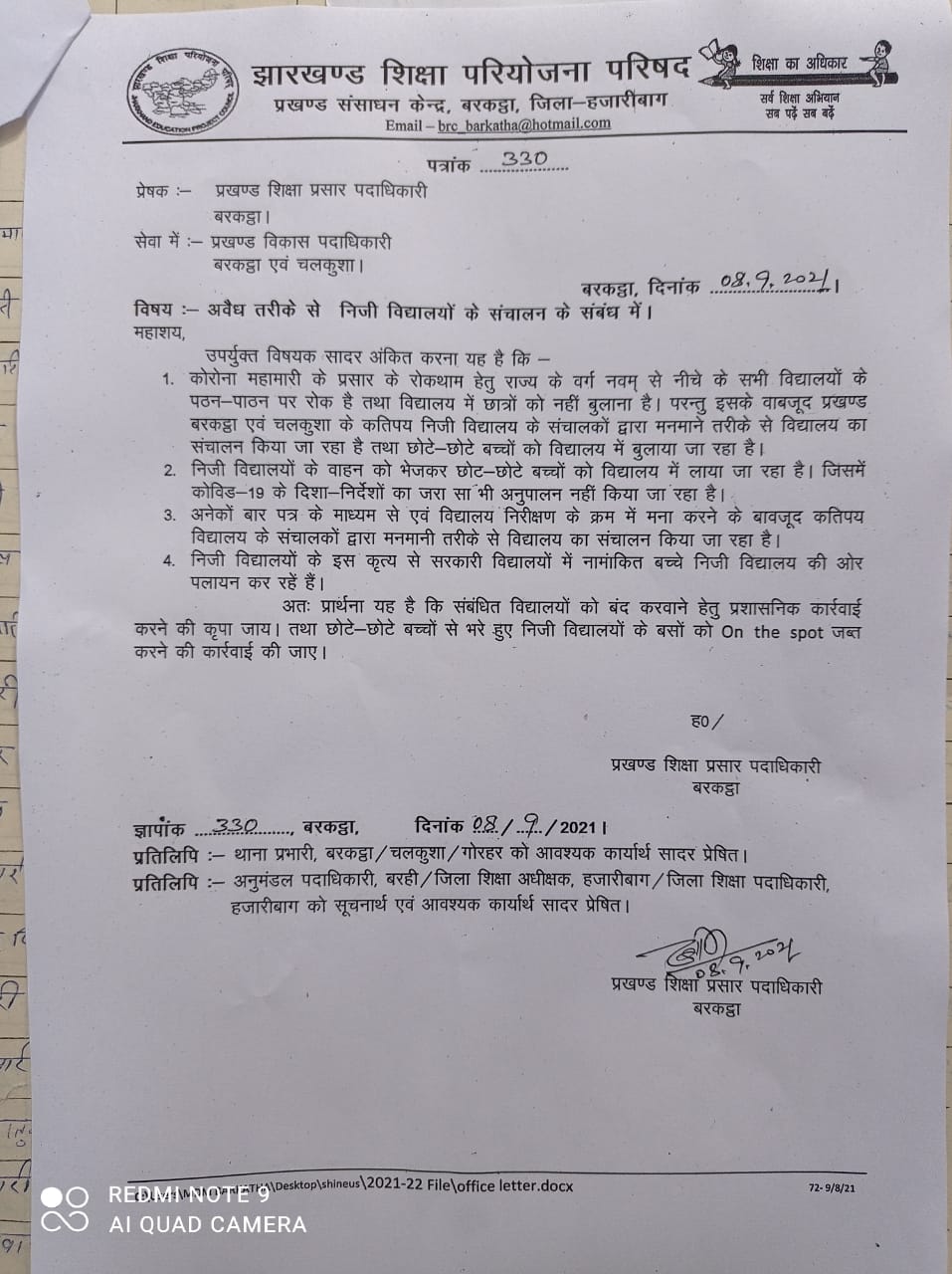 उन्होंने आग्रह पूर्वक कहा है कि संबंधित विद्यालयों को बंद करवाने तथा ऐसे विद्यालयों के वाहनों को जप्त करने हेतु प्रशासनिक कार्रवाई की जाए।पत्र की प्रतिलिपि बरकट्ठा व चवकुशा के थाना प्रभारियों,अनुमंडल पदाधिकारी,डीईओ हजारीबाग को प्रेषित की गई है।